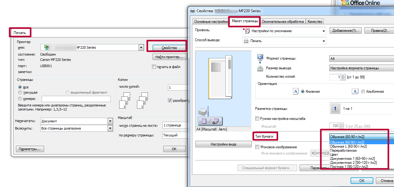 - Если вы используете нестандартные размеры или типы страниц, вы должны «уведомить» принтер. Эти настройки должны быть сделаны в свойствах печати используемой вами программы. Например, так это будет выглядеть для Word.