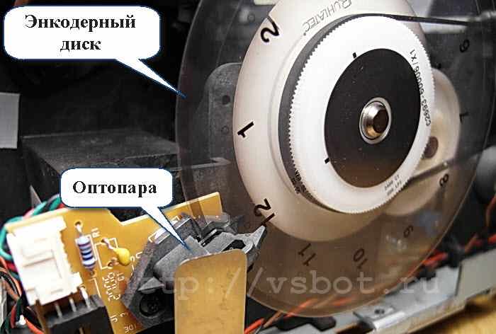 Еще один датчик-энкодер расположен на валике подачи бумаги — только он выполнен в виде коротких радиальных непрозрачных штрихов на круглой прозрачной пластмассовой детали.