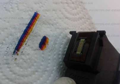- Положите на стол чистую белую салфетку. Слегка нажмите на каждый картридж по очереди. На поверхности салфетки должен остаться четкий след краски. Цветной CL 441 должен иметь трехцветную дорожку.