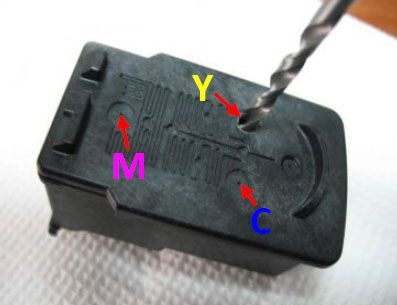 Заправка будет происходить через воздушные отверстия под наклейкой на передней части чернильницы. Если диаметр отверстия небольшой, увеличьте размер шилом, дрелью или отверткой.