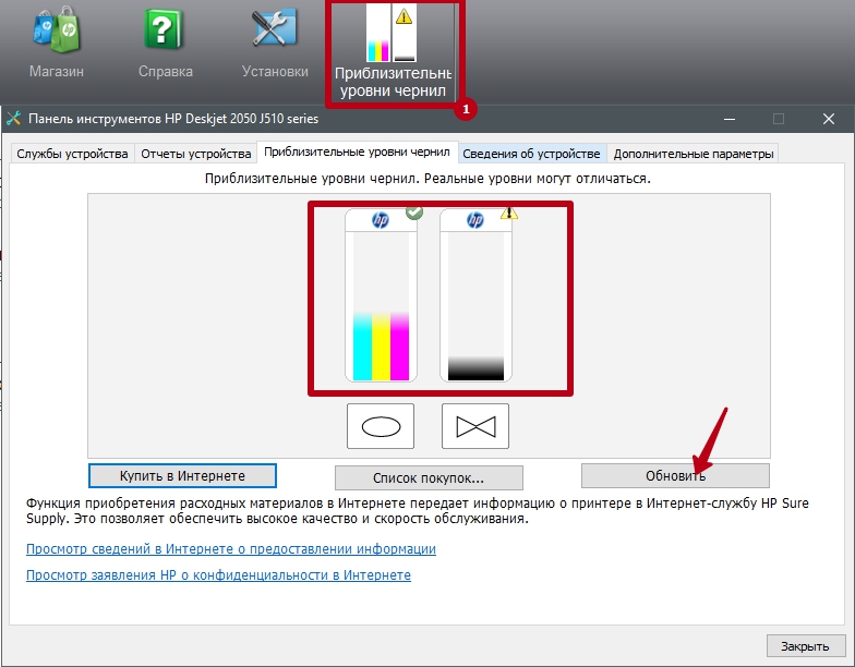Для своевременной заправки картриджа новыми чернилами в программном обеспечении (драйвере) предусмотрен инструмент для контроля уровня чернил, как для цветных, так и для ч/б картриджей. Запустите сканирование при первых признаках нехватки емкости.