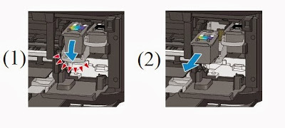 - Снимите кассету с каретки. Откройте крышку, переведите каретку в среднее положение. Аккуратно нажмите на верхнюю часть контейнера до щелчка. В этот момент чернильница изменит положение и можно будет произвести полное извлечение, потянув ее на себя.