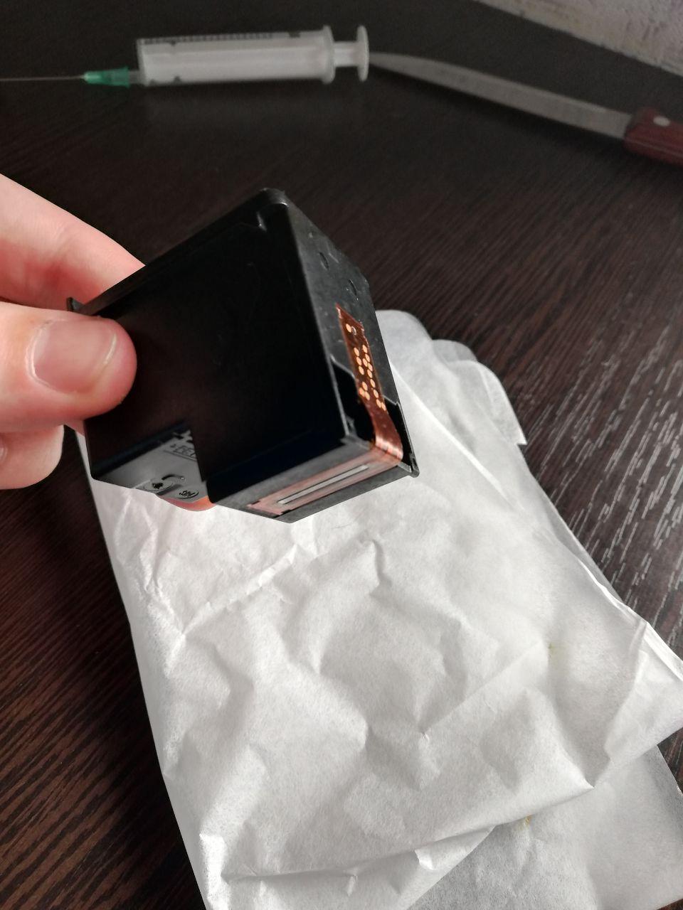 - Когда бутылочка наполнится и чернила начнут выходить через отверстия, прекратите процедуру. Излишки чернил откачиваются обратно в шприц с 1 мл, и поверхность корпуса хорошо протирается салфеткой, чтобы не было следов/грязи. Обратите особое внимание на контакты, если на них есть чернила, принтер может не увидеть картридж после заправки.