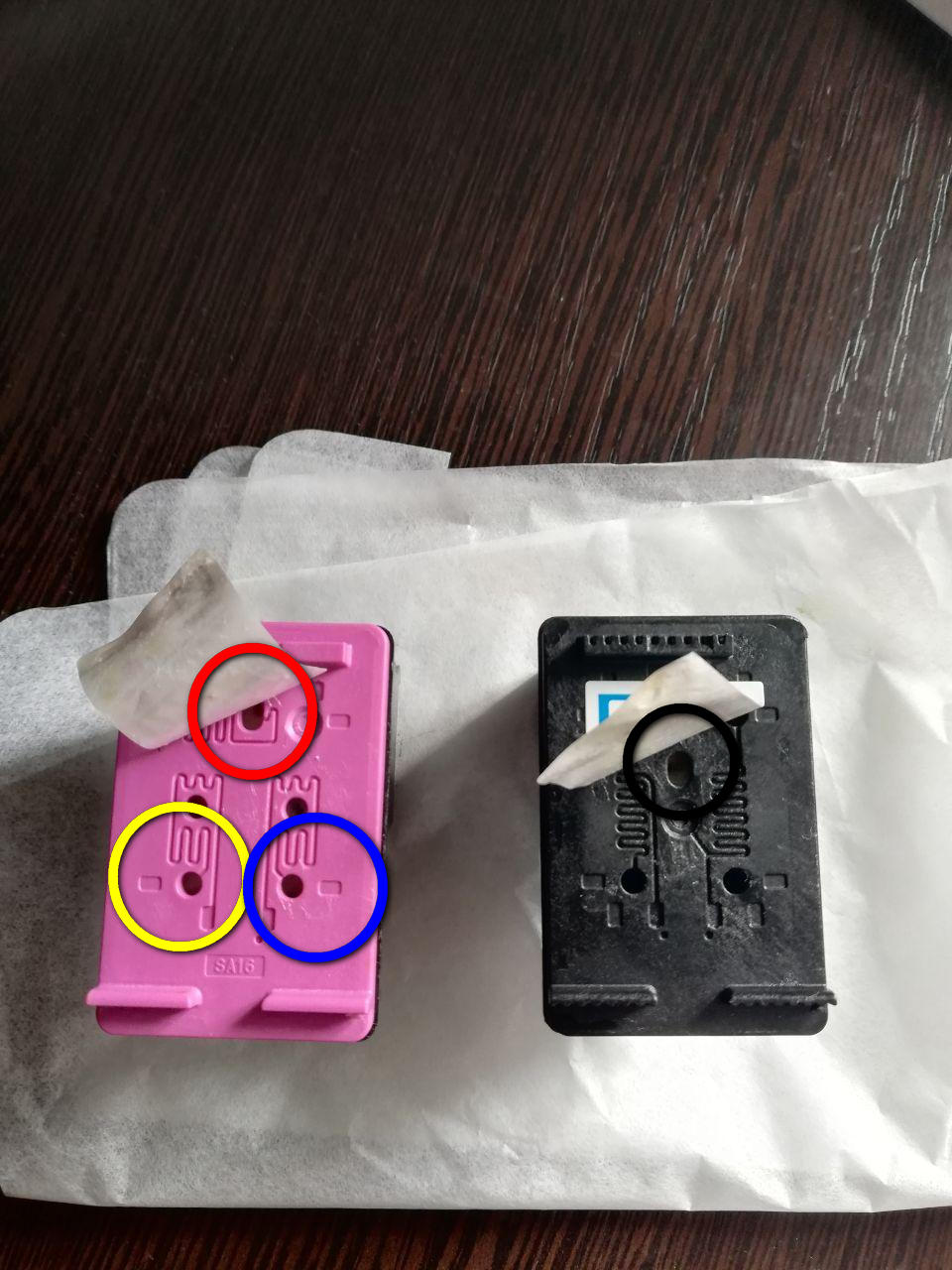 - также важно знать схему отверстий для каждого цвета. Вы можете найти его в Интернете, выполнив поиск по запросу «цветовая схема модели картриджа». Смешивание оттенков может повредить картридж.