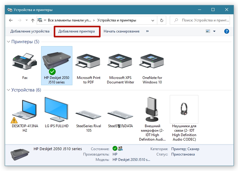 Если проблем с оборудованием нет, но аппарат по-прежнему не работает, проверьте, добавили ли вы его в качестве устройства печати. Да, как правило, внешнее оборудование компьютер определяет автоматически, но в случае возникновения проблем эту операцию необходимо выполнить вручную: