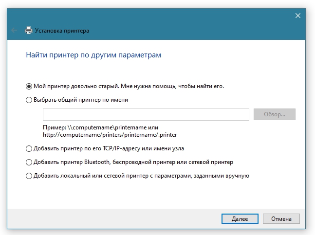 Во втором случае нажмите на пункт «Требуемый принтер отсутствует в списке», который отображается под индикатором хода поиска. У вас будет возможность установить принтер по другим параметрам: укажите адрес в сети, учтите, что принтер уже старый (в этом случае система будет искать его с измененными параметрами), добавьте беспроводной принтер.