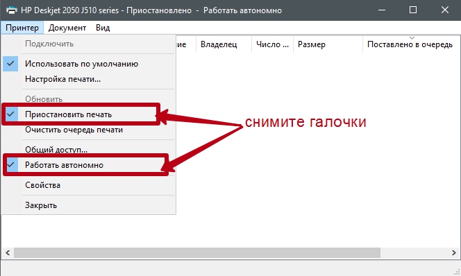 2. Проблема с настройками. Если принтер HP Deskjet 2130 не печатает, хотя чернила есть, перейдите через «Пуск» в «Панель управления» — «Оборудование и звук» — «Устройства и принтеры». Найдите нужную модель и щелкните по ней правой кнопкой мыши. Откройте Показать очередь печати. Если в очереди есть зависшие задания, снимите флажки рядом с функциями «Задание в автономном режиме» и «Приостановить печать» в разделе «Принтер». Затем очистите очередь печати и установите флажок «Использовать по умолчанию».