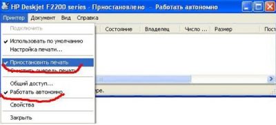 - Рядом с пунктом «Работать автономно» или «Приостановить печать» может стоять галочка. Удалите его, чтобы отключить автономную работу.