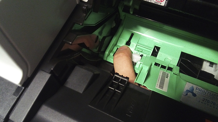 - Дотроньтесь до флажка пальцем и удерживайте его, вставив руку в отверстие для выхода бумаги.