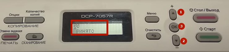 Выполните первые три шага из первого метода. Нажмите кнопку с цифрой «1». Подождите, пока на экране не появится надпись «Принято». Теперь можно продолжить печать.