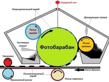 Лазер, попадая на фотопроводник, изменяет заряд только в определенной области. Порошковый цвет — тонер наносится поверх стержня. Намагничивается он только в тех местах, где не совпадает по заряду с поверхностью вала. В результате изображение переносится на бумагу. Под воздействием высоких температур порошок запекается и остается на листе бумаги.